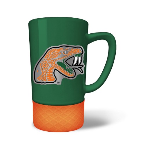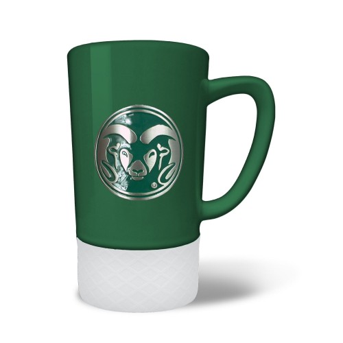 The 18 oz. JUMP team color ceramic coffee mug features a silicone base in coordinating team color and a hand crafted metal emblem.