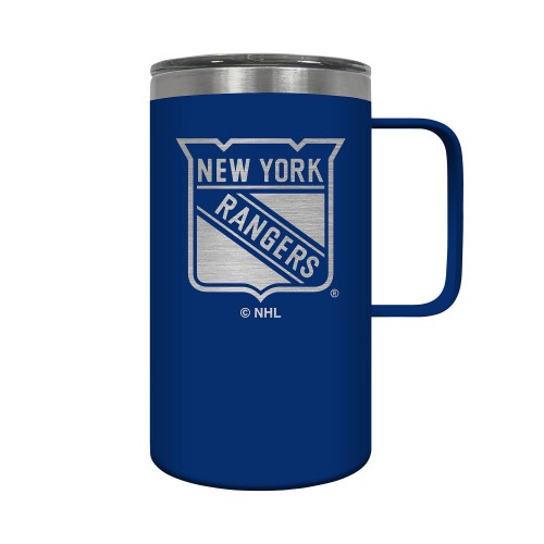 The Hustle is a 18oz vacuum insulated travel mug with large handle. Includes spill resistant lid and features laser etched team graphics.