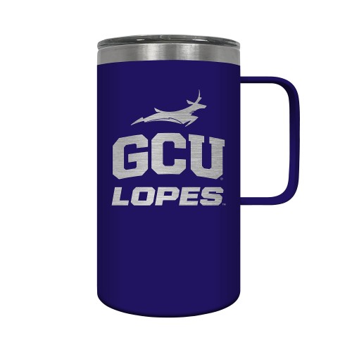 The Hustle is a 18oz vacuum insulated travel mug with large handle. Includes spill resistant lid and features laser etched team graphics.