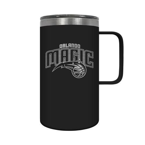 The Hustle is a 18oz vacuum insulated travel mug with large handle. Includes spill resistant lid and features laser etched team graphics.