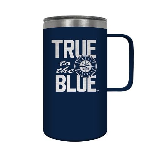 The Hustle is a 18oz vacuum insulated travel mug with large handle. Includes spill resistant lid and features laser etched team graphics.