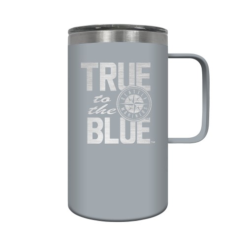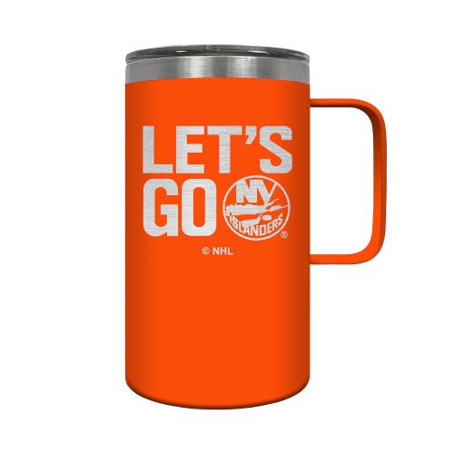 The Hustle is a 18oz vacuum insulated travel mug with large handle. Includes spill resistant lid and features laser etched team graphics.