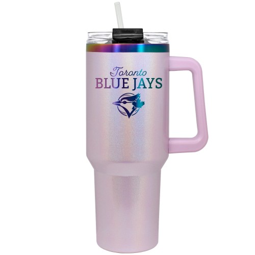This 40 oz. COLOSSUS travel mug is made of high quality vacuum insulated stainless steel. It features premium multi-color radiance undertones with durable powder coated pink sparkle finish and laser etched team graphics.