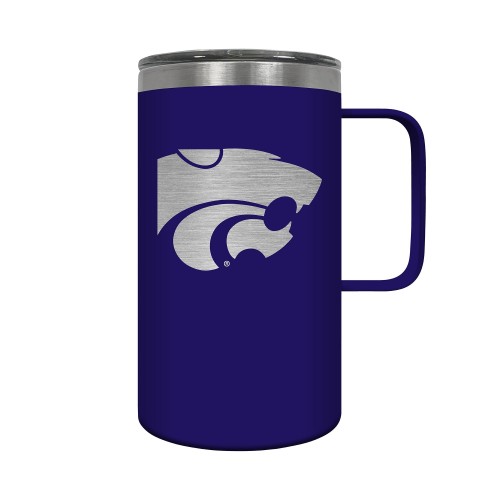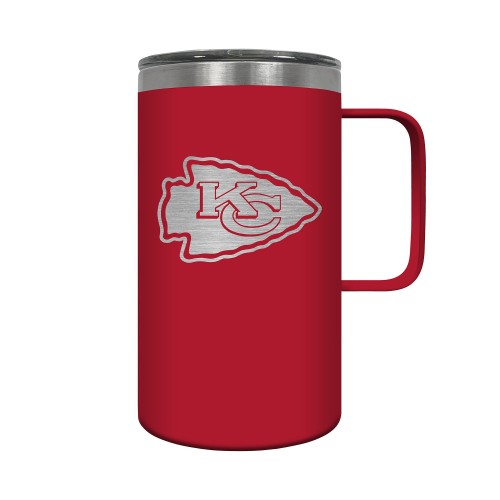 The Hustle is a 18oz vacuum insulated travel mug with large handle. Includes spill resistant lid and features laser etched team graphics.