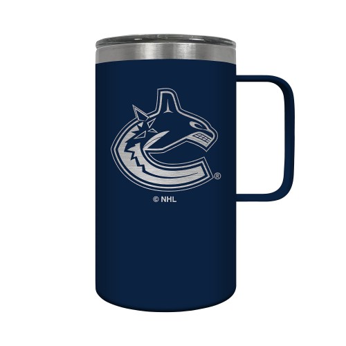 The Hustle is a 18oz vacuum insulated travel mug with large handle. Includes spill resistant lid and features laser etched team graphics.