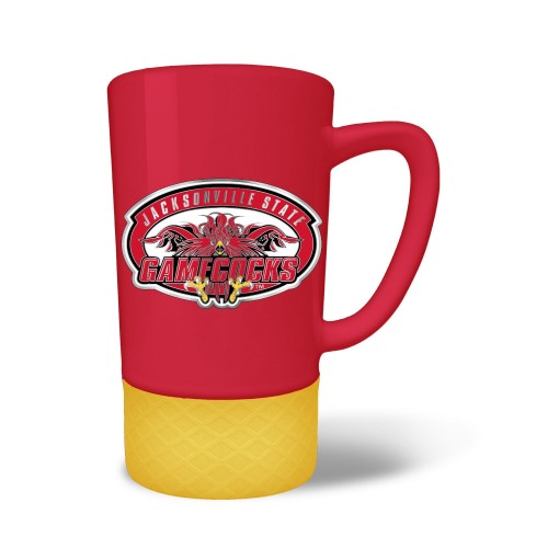 The 18 oz. JUMP team color ceramic coffee mug features a silicone base in coordinating team color and a hand crafted metal emblem.
