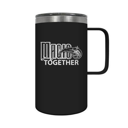 The Hustle is a 18oz vacuum insulated travel mug with large handle. Includes spill resistant lid and features laser etched team graphics.