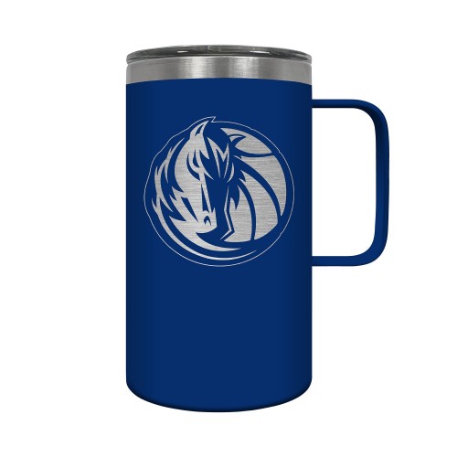 The Hustle is a 18oz vacuum insulated travel mug with large handle. Includes spill resistant lid and features laser etched team graphics.