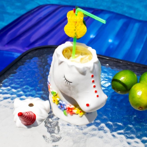 Just like plants in a garden, we all need some liquid to help liven us up a bit, and you can get just that with this adorable ceramic watering can tiki mug. This mug is an adorable and fun way to serve up some tasty cocktails and many other types of beverages to your guest and patrons. Has a liquid capacity of 22 ounces and measures 4.75″ H x 8″ Wand has a rim dimeter of 3.25″. This product is recommended to be hand washed only.
