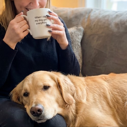 Start your day with a chuckle by sipping your coffee from the 16oz matte white ceramic mug that reads “When I Die My Dog Gets Everything” on the outside and “That’s All” on the inside. This quirky mug with a glossy teal blue interior makes a fun and relatable gift for the dog lover in your life!