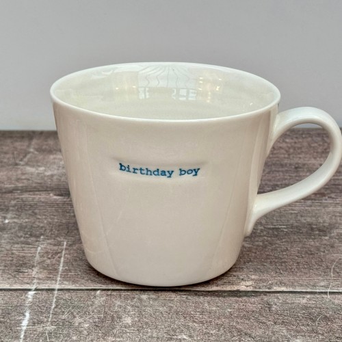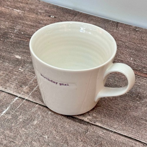 A white mug with ‘birthday girl’ written in pink on one side.